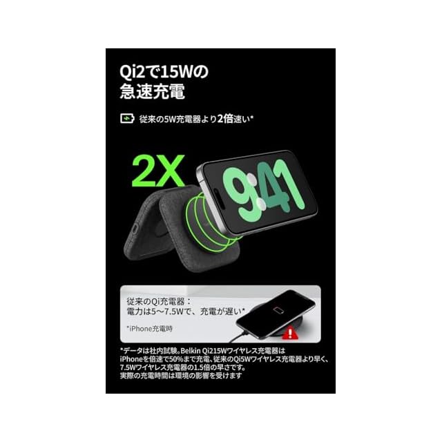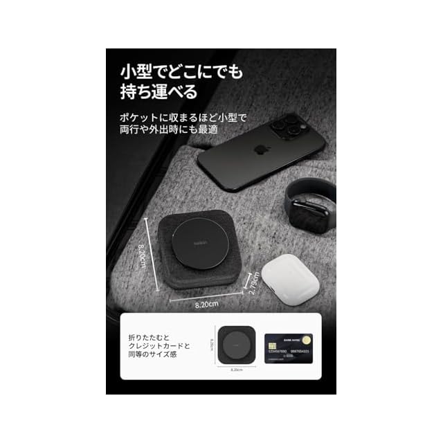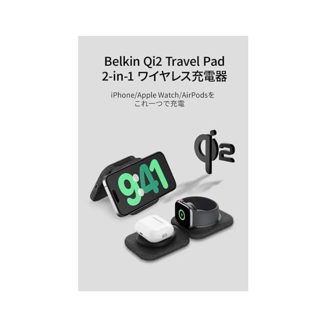 商品名:Belkin [Apple公認] 2-in-1 Qi2ワイヤレス充電ポータブルパッド公式認証/MagSafe対応 iPhone 16/15/14/13/12/スマートフォン(最大15W高速充電) Apple Watch 10/9/8/7/Ultra/Ultra2(急速充電対応) USB-Cケーブル付属(1.5m) AC電源アダプター付属 ブラック WIZ026dqBK