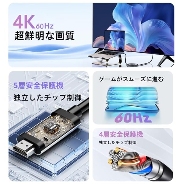 【4K@60Hz・HDR高画質対応・音声同期】 4K(3840×2160)@60Hz超高解像度出力に対応し、HDR(ハイダイナミックレンジ)による鮮やかな色彩表現が可能です。映像と音声を完全同期再生し、映画、ゲーム、リモート会議などに最適なリアルな映像体験を提供します。