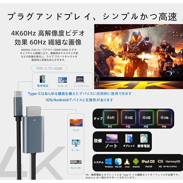 商品名:HDMI Type-C to HDMI ケーブル 2m【4K@60Hz HDR対応 音声同期】タイプC HDMI変換ケーブル MacBook/iPad/iPhone 15 Pro以降/スマホtype c 3.1接口/ノートPC対応 ゲーム/会議/プレゼン用 高耐久 プラグアンドプレイ