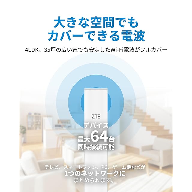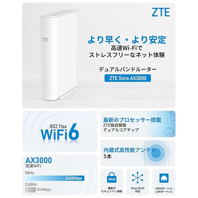 商品名:ZTE WiFi ルーター 無線 LAN Wi-Fi 6 11ax / 11ac AX3000 2402 + 574Mbps IPv6 WPA3 EasyMesh メッシュ 対応 デュアルバンド 160Mhz 中継器【 iPhone 16 / 15 / 14 / 13 / Nintendo Switch / PS5 動作確認済み 】 3階建4LDK Sora AX3000 ZXHN Z1321