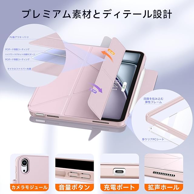 <b>商品説明:</b><br> 商品名: iPad専用カバー<br> 材質: 皮革、高品質PC、TPU<br> カラー: ブラック、グレー、ピンク<br> 対応サイズ: 10.9インチ/11インチ<br> デザイン: マグネット式/分離式デザイン<br> <br> <b>特徴:</b><br> 1.全面保護で傷防止<br> 2.マルチアングル調整可能、横向き&縦向き対応<br> 3.内側カバー単体使用可、ゲーム操作しやすい<br> 4.高品質素材で頑丈・耐久性抜群、衝撃吸収<br> 5.防塵・防汚、お手入れ簡単<br> 6.内側カバーの四隅に簡易放熱孔設計<br> <br> <b>使用方法:</b><br> 内側カバーの透明パネル両面に保護フィルムが貼られています。取り付ける前にフィルムを剥がしてください。角から剥がすと簡単です。<br> <br> <b>同梱内容:</b><br> マグネット式外カバー×1<br> 透明内カバー×1<br> <br> <b>ご注意:</b><br> 1.画面表示と実物では色味に若干の差異が生じる場合がありますが、使用に支障はありません<br> 2.お使いのタブレットのモデルを確認の上、対応サイズのカバーをご購入ください<br> 3.製品についてご質問やご不明点がございましたら、メールでお問い合わせください<br>
