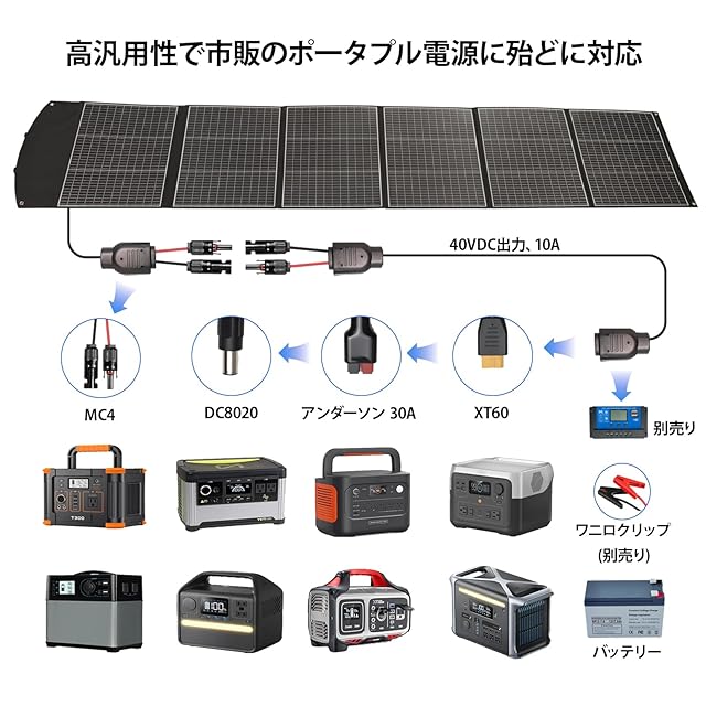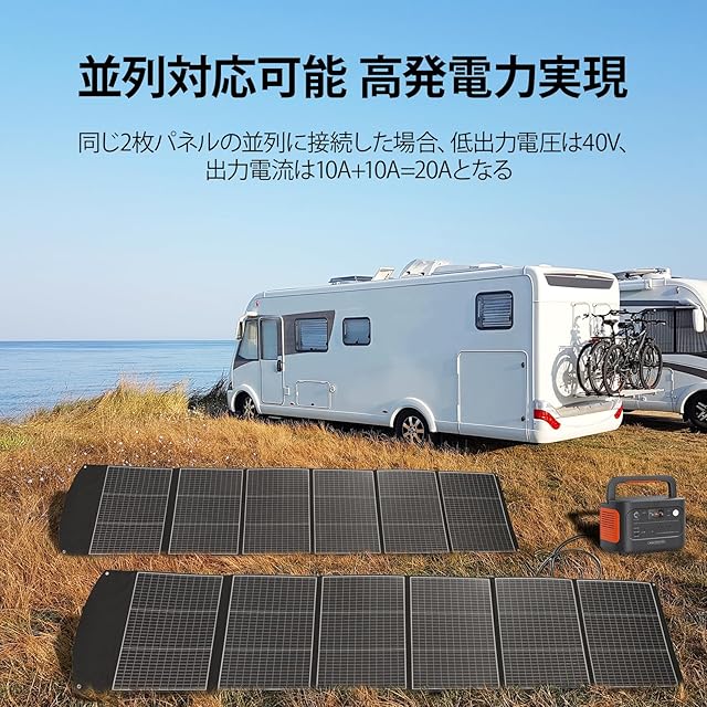 【幅広い互換性 ・ポータブル電源用】400W太陽光パネルはMC4ケーブル付き、MC4からDC8020/Anderson 30A/XT60 3-in-1ケーブル付属されています。市販のほとんどのポータブル電源(Jackery/Bluetti/Anker/ALLPOWERSなどに対応できる)にも充電できます。高効率により、太陽を最大限に活用し、太陽光を電気エネルギーに変換できます。緊急時だけでなく、日常生活で使用で、月々の電気使用量を減らす節電にも役立ち、環境にやさしいエコなライフスタイルを実現することができます。( このパネルの開放電圧:48V±5% 短絡電流:10.8A±5% お手元のポータブル電源の最大入力仕様を必ずご確認ください。適合しない場合は、対応するMPPTコントローラーの購入が必要となります。)また、多枚ソーラーパネルを組み合わせ、直列または並列に使用することで複数の充電を行い、ポータブル蓄電池、自動車バッテリーなどに給電できます。