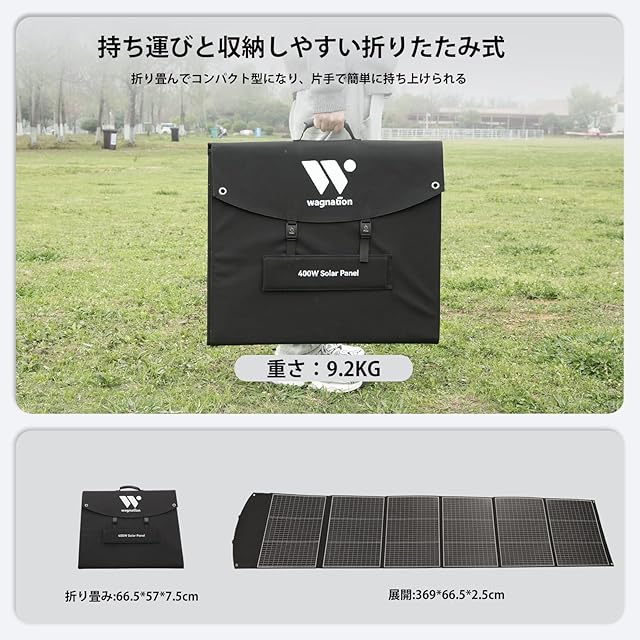 商品名:ソーラーパネル 400W 太陽光パネル 折りたたみ式 40VDC出力 10A ポータブルソーラーパネル 単結晶 ソーラー充電器 携帯 MC4ケーブル付き ポータブル電源用 軽量 太陽光発電パネル 防水 スタンド付き 非常時 キャンプ アウトドア 車中泊 停電防災グッズ
