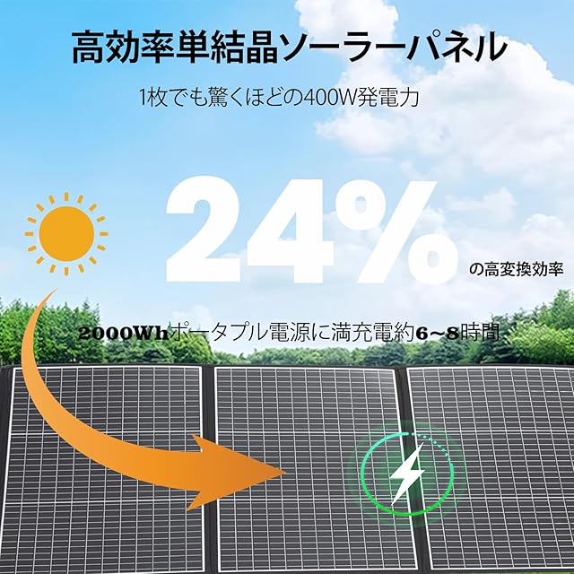 <p>製品について理解してから購入してください。本製品は蓄電できません!</p> <p>陽光を当てるだけで発電でき、コンセントがない場所でも充電できます。</p> <p>400Wソーラーパネルというのは、赤道環境または研究室で十分な光線を商品に当たれば、MAX 400Wの発電が実現できるものであり、いつでも400Wの発電があるのではございません。</p> <p>ソーラーパネルの発電効率は太陽光の強さ、パネルの表面温度、太陽光線との角度などいろいろな因子に影響されますので、ご利用の際にはできる限り不利因子を避けて使用してください。</p> <p>ポータブルな構造を採用したことにより距離旅行や登山、 ハイキング、BBQなどのアウトドアに最適なつくりとなっております。地震 ・ 災害時にも非常用電源としても大活躍です。</p> <p>発電量が低いという方が散見されますが、ソーラーパネルの問題ではないもあります。</p> <p>コードが1Aまでしか対応していないとか、充電機器側で一定電流までしか受け付けないとか、他に問題がある場合があります。ソーラーパネルに表示されるのは「発電量」ではなく、現在「通電している量」なので、2A発電できる環境であったとしても、機器が対応していなければ1Aの表示になります。</p> <p>6枚単結晶シリコンソーラーパネルで構成されるパネル。折りたたみ可能なデザイン、ソーラーパネルは持ち運びが簡単で、バーベキュー、キャンプ、車中泊、RV、ハイキングなどのアウトドア用だけではなく、災害発生時の停電対策としてもおすすめです。</p> <p>ソーラーパネル 太陽光パネル ソーラーチャージャー DC出力 折り畳み式ポータブルソーラー充電器 単結晶 高変換率 急速充電 防災 アウトドア ポータブル電源用 太陽光発電 ソーラーチャージャー高効率 ソーラー充電器 防災持ち運びやすい 外出 プレゼント 父の日 母の日 防災の日 防災グッズ 災害時 停電対策 環境保護 地球温暖化 防水防塵 ポータブル電源充電器 軽量 コンパクト </p>
