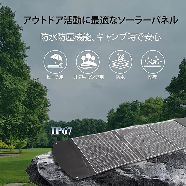 【折りたたみ式、持ち運びにも便利】ソーラーチャージャーはコンパクトサイズに折り畳むことができます。持ち運びが楽で、移動中に破損しにくいです。折り畳み時のサイズは約665*570*75mm、展開時約3690*665*25mm、9.2kgで、キャンプ、お釣り、車中泊などのアウトドア活動や、防災用具としておすすめです。 ポータブルな構造を採用したことにより距離旅行や登山、 ハイキング、BBQなどのアウトドアに最適なつくりとなっております。地震 ・ 災害時にも非常用電源としても大活躍です。