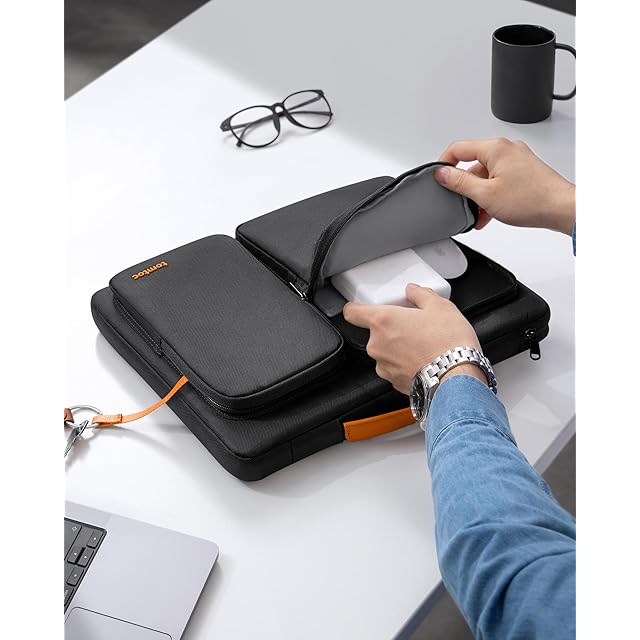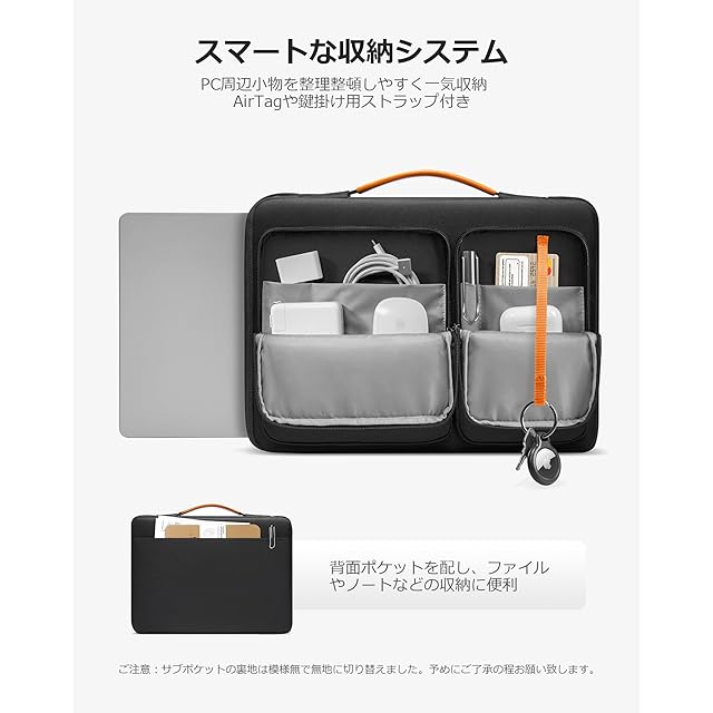 【スマートな3室サブ収納】このノートPCケースは二つ大きなフロントポケットが備え、その中に多数な小さいポケットやAirTag /鍵掛用ストラップを配します。電源、ケーブル、ハブ、Kindleなどのガジェットをすっきり収納できます。それに加え、背面にも大きなポケットがあり、書類やよく取り出す物の収納に適します。