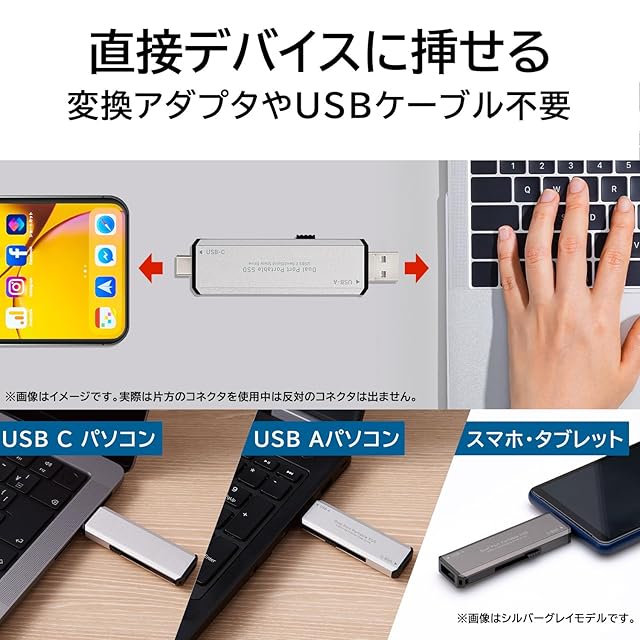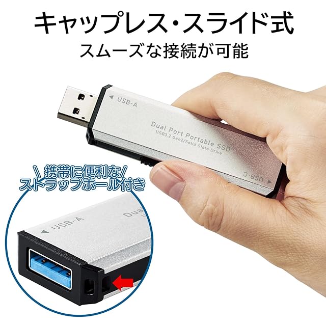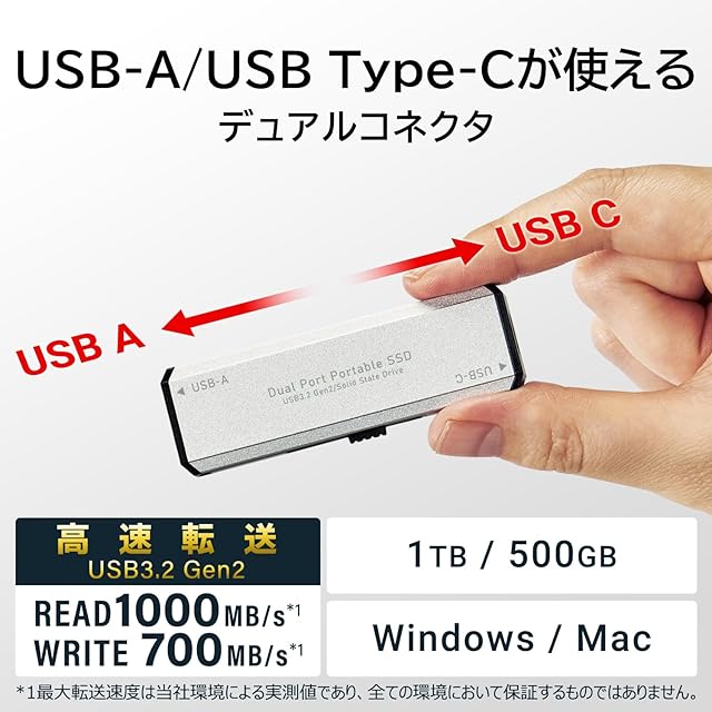 読み込み最大1,000MB/s、書き込み最大700MB/sを実現したUSBメモリタイプのスティック型SSDです。USB-C/A両方使え、USB端子に直挿しで接続できます。USB3.2 Gen2対応で、大容量データの高速転送が可能です。PS5/PS4の拡張ストレージとしてや、テレビ録画にもご使用頂けます。