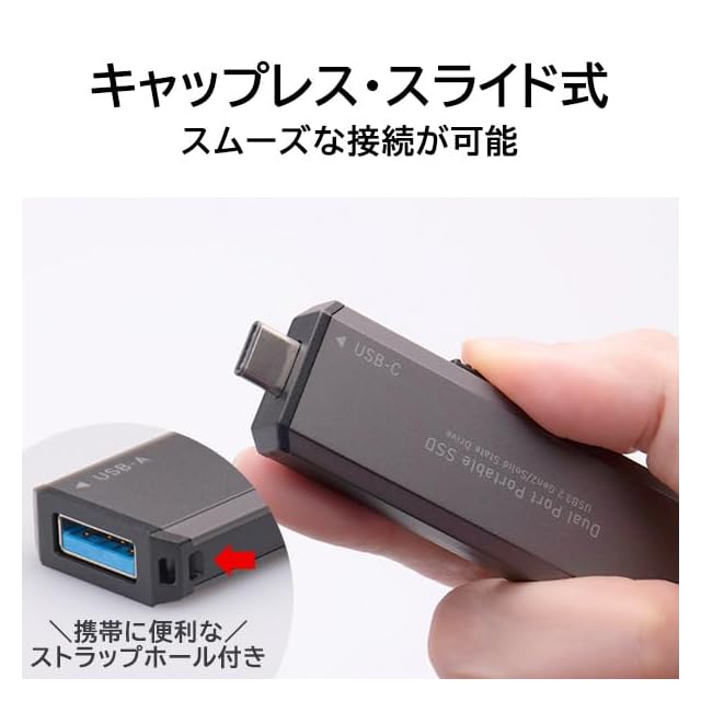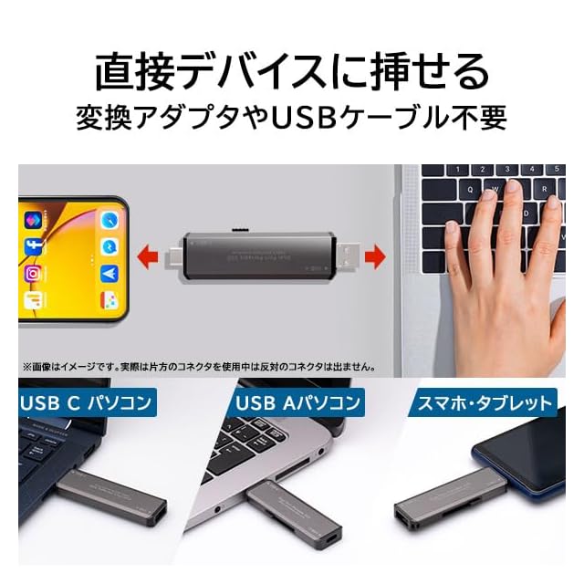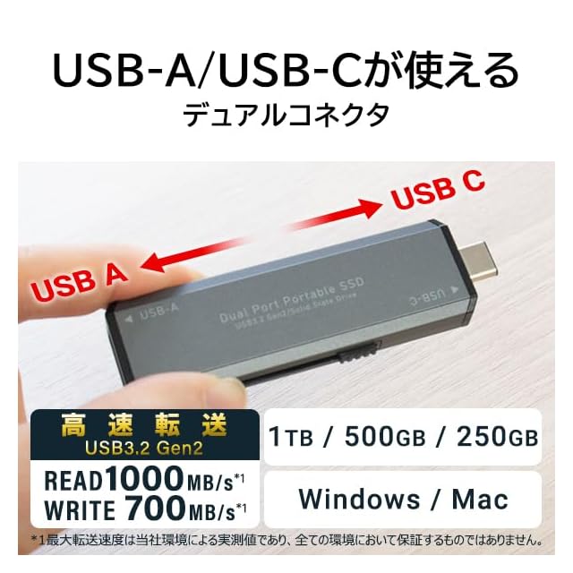 読み込み最大1,000MB/s、書き込み最大700MB/sを実現したUSBメモリタイプのスティック型SSDです。USB-C/A両方使え、USB端子に直挿しで接続できます。USB3.2 Gen2対応で、大容量データの高速転送が可能です。PS5/PS4の拡張ストレージとしてや、テレビ録画にもご使用頂けます。