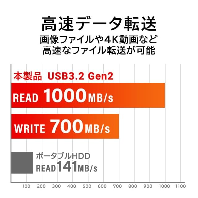従来モデルよりグレードアップした内蔵SSDを採用したことで、読み込み最大1,000MB/s、書き込み最大700MB/sを実現。USB3.2 Gen2の性能を最大限発揮することができ、大量の画像ファイルや4K動画などの大容量ファイルをストレスなく転送できます。Windows、MACパソコンの他にゲーム機にもお使いいただけます。 ※USB3.2 Gen2の性能を発揮するには、PC側もUSB3.2 Gen2転送に対応している必要があります。 ※USB3.2(Gen1)/USB3.1(Gen1)/USB3.0に接続した場合5Gbps(理論値)となります。 ※比較製品(USBメモリ:ロジテックLMC-64GU3シリーズ/ポータブルHDD:ロジテックLHD-PBMBU3QWシリーズ/ポータブルSSD:ロジテックLMD-PBLU3BKシリーズ) ※弊社テスト環境での実測値です[ベンチマークソフト] CrysrtalDiskMark8.0.4 シーケンシャルリードの実測値
