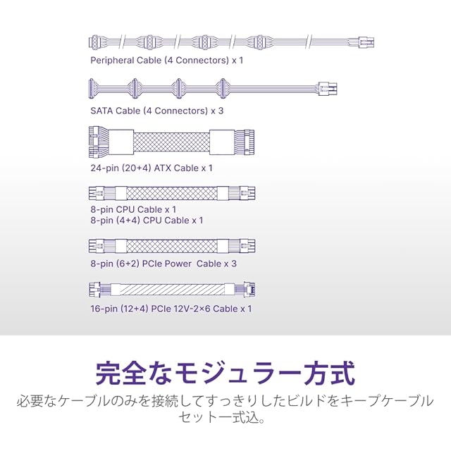 必要分の接続に応じてケーブルを着脱可能なフルモジュラータイプを採用。PCケース内部のエアフローなどを考慮したケーブルの取り回しを行うことが可能です。