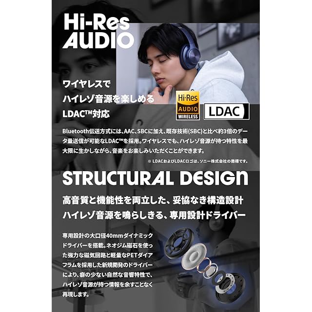 高解像度サウンド: 専用設計の40mm「ハイレゾ対応ダイナミックドライバー」により、自然でクリアな高音質を実現。音楽の細部まで鮮明に再現します。