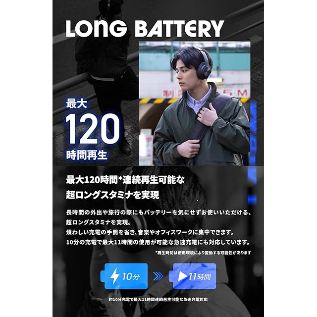 長時間再生バッテリー: 「最大120時間連続再生」を可能にする大容量バッテリーを搭載。長旅や外出時にも安心して使用できます。