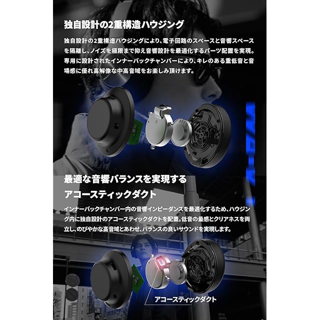 音響バランスの最適化: 独自の「アコースティックダクト設計」により、重低音と中高音域のバランスを調整。リスナーに最適な音響体験を提供します。