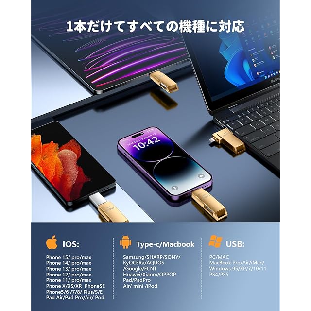 ✔【Apple MFi認証取得・高い互換性】iPhone 用USBメモリでは、アップルが設けた認証プログラム Apple MFi が認定されております。これアイフォン バックアップはアップルより提供されたライトニングコネクタを使って、アップルのサポートを受けて作成された周辺機器です。なので、すべてのiPhoneおよびiPadシリーズと互換性があります。iPhone 14 /14 Pro/13 Pro Max/13 mini/ 12 /12 Pro/12 Pro Max/12 mini/ 11 /11 Pro/11 Pro Max / SE/X /XS/XS Max /XR/8 Plus/8 / 7 Plus/7 /6s Plus/6s/6 6 Plus /iPad Air iPad(第9/8/7/6/5世代)iPad mini(第6/5/4/3世代)10.5インチiPad Pro 9.7インチiPad Pro / iPod touch 6/7/ MacBook Air/Macbook Pro/ iMac/PC /ノートパソコンなどのデバイスに対応します。