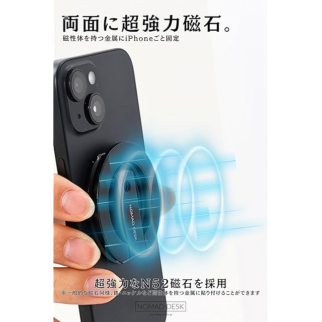 【強力両面マグネットでしっかり固定】超強力な磁力を持つN52グレードのネオジム磁石を採用。MagSafeでiPhoneに簡単に装着できるだけでなく、リングスタンドの反対側にも強力マグネットを搭載。浴室の壁(タイル等を除く)、ジムのマシン、冷蔵庫、レンジフード、ホワイトボード、有孔ボード、スチール製のモニター台や棚、車載磁気ホルダー、現場設備など、様々な場所にiPhoneを固定し、両手を自由に使えます