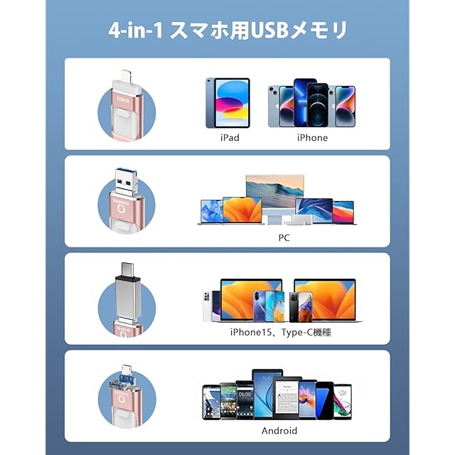 【4in1 USBメモリー】USBメモリ 256GBはiOS、Type-C、USB、Micro USBの四つのコネクタが搭載され、コネクタが一つしかないUSBメモリーと比べ、新版4-in-1のiPhone対応USBメモリはより革新です。差込口によって、異なる機種を接続でき、機種の間でデータ移行は楽になり、写真、動画やファイルなどのデータも共有でき、ネット、WIFIやiTunesがなくてもデータバックアップは簡単になります。更に、USBメモリー内のデータは選択してから直接に他の連絡先に共有できます。