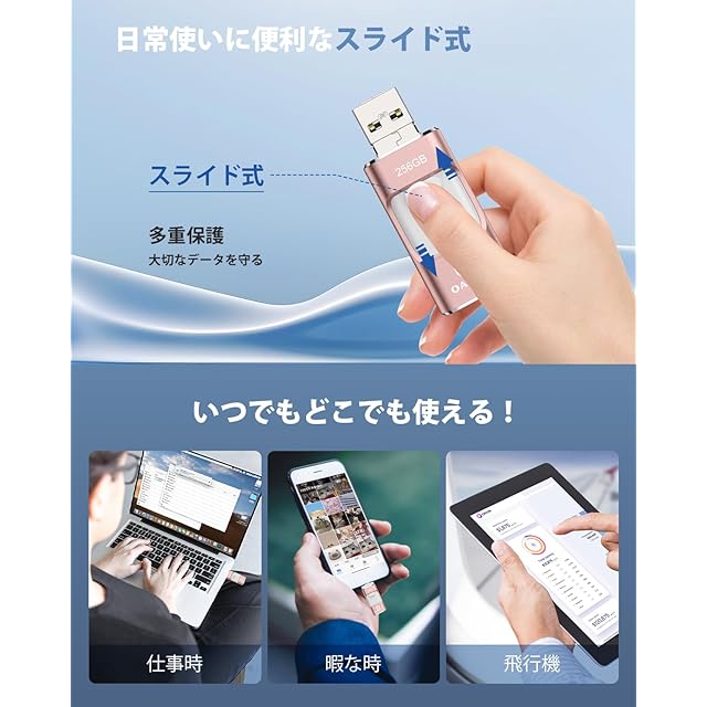 【スライド式・利便性に優れる】主にスマホ用なので、スライド式のUSBメモリーはより使いやすくて、収納もしやすいです。真ん中にスライドボタンがあり、上下にスライドしてコネクタを変更できて、様々な機種に対応しやすいです。しかも収納ケースとiOSコネクタカバーも付いており、日常使いにとても便利です。材質の方には、各性能に優れているアルミニウム合金を採用しており、耐久性は抜群で、安心してご利用いただけます。