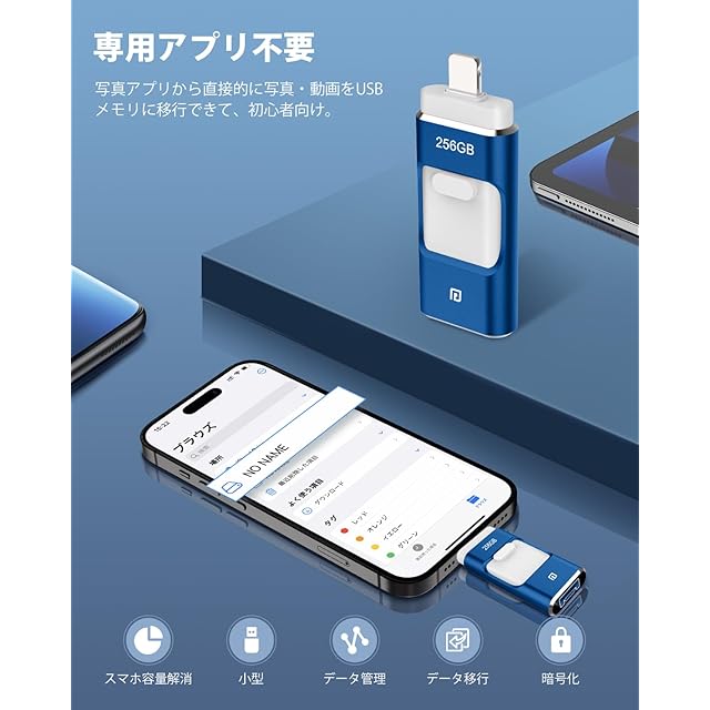 【アプリ不要、全面的にアップグレード!】専用アプリをダウンロードしないと使えない?最新技術でアップグレードされた新登場のiPhone対応USBメモリは、専用アプリをダウンロードせずにデータを移行できて、専用アプリから解放します。USBメモリーをスマホに挿入するだけで、写真や動画などのデータをスマホのアルバムからUSBメモリに保存できて、スマホに付属している「ファイル」アプリではUSBメモリーに保存されているデータを確認できます。