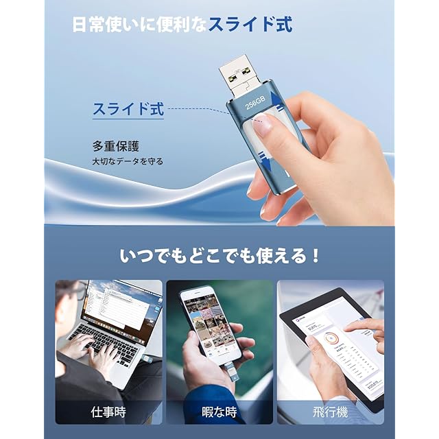 【高速でデータ移行・12ヶ月間】USB2.0により、USB3.0のUSBメモリーはより高速で、データが多くても、より短い時間で転送できます。高速的なテクノロジー時代に欠かせないiPhone対応USBメモリです。USBメモリーの読み込み速度は30-80MB/sに達することができ、書き込み速度は10-30MB/sに達することができます。(実際の速度はハードディスクの読み込み速度、書き込み速度と関係があります)。こちらのUSBメモリ256GBは1年間の品質と購入後の3ヶ月内で初期不良の交換サービスを行っておりますので、安心してご購入頂けます。初期不良および使用中の故障がございましたら、各種対応をさせて頂きますのでご安心ください。