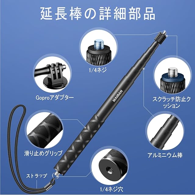 商品名:Mairan 超長150cm Insta360用見えない自撮り棒 GoPro用アダプター付き DJIアクションカメラ用自撮り棒 1/4インチネジ 7階伸縮 ストラップ付き 軽量 アルミ製GoPro hero12用/11/10/9/Insta360X4,X5用/X3/DJI Osmo Actionに対応 セルフィー/撮影録画/動画鑑賞配信に最適