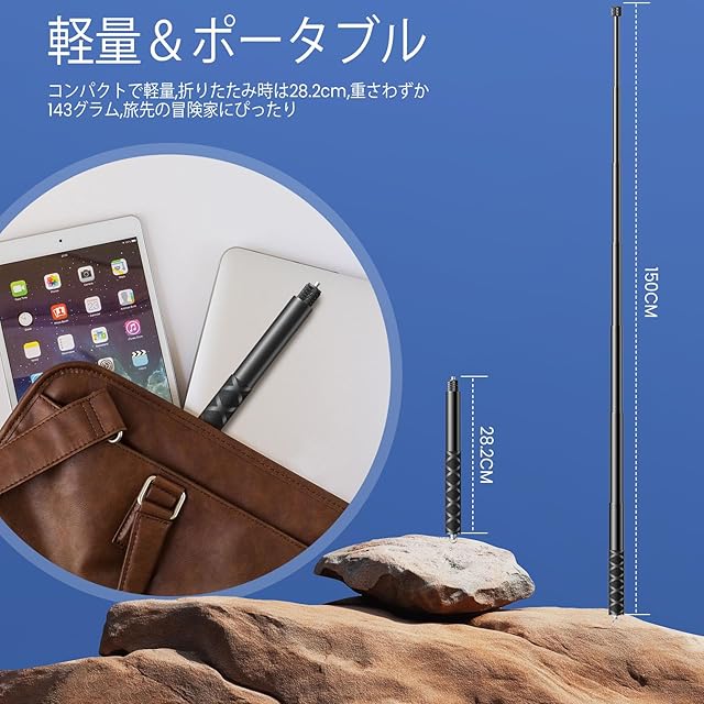 【軽量で持ち運びに便利】携帯用伸縮ポール長さ – 28.2センチから最長150センチまで自由に伸縮可能で重さはわずか0.143キロ