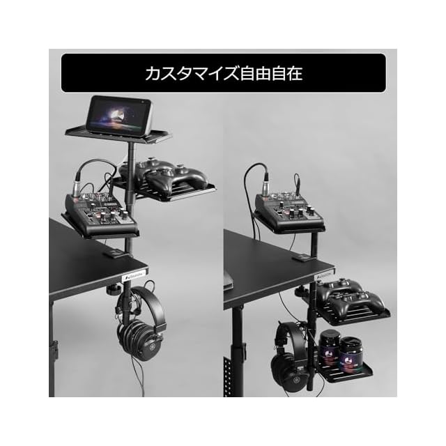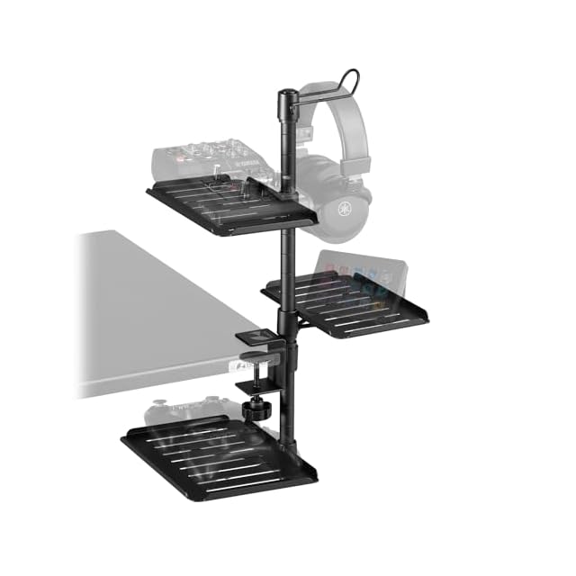 【デバイスを浮かせて収納】クランプ固定式の収納スタンドです。オーディオインターフェースなどの周辺機器3つ+ヘッドセット1つを、いつでもサッと手に取れるポジションへと配置可能です。