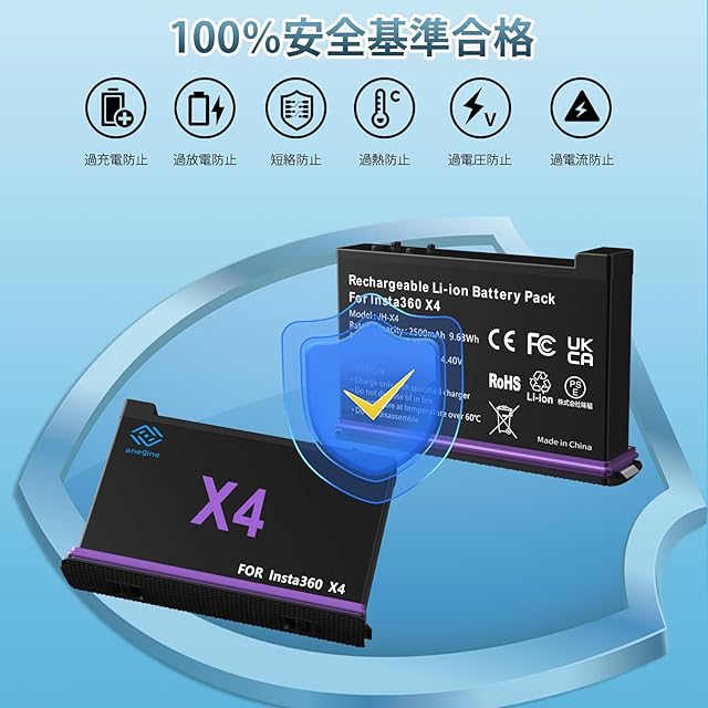 【保護回路】 Insta360 X4 バッテリー には過充電防止機能 過放電防止機能 ショート防止機能 過熱防止機能 過電圧防止機能 過電流防止機能を内蔵しているので、安全に使用でき、損害を与えることはありません。