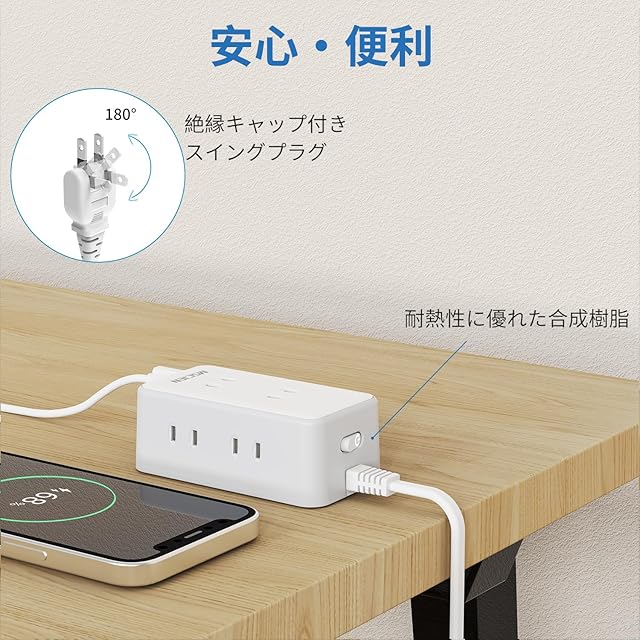【スイングプラグ・壁掛け用フック穴】:スイングプラグは180°回転できるので、狭いスペースでも配線しやすいです。壁掛け用フック穴があり、壁等の場所に掛けて使用できます。