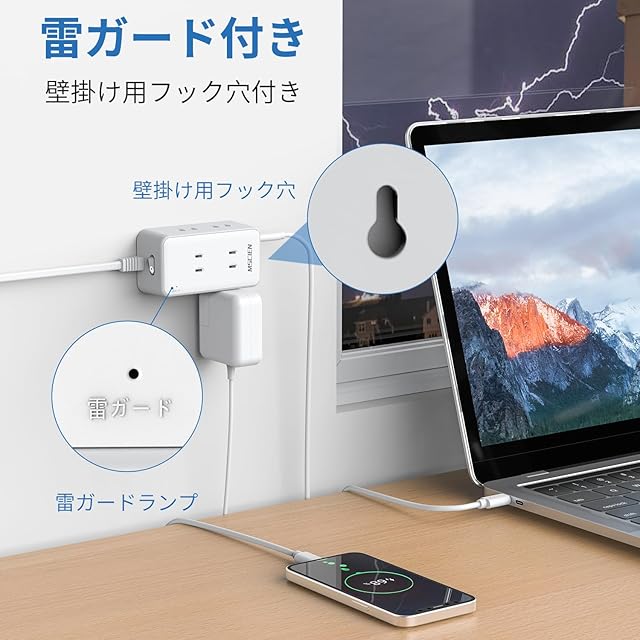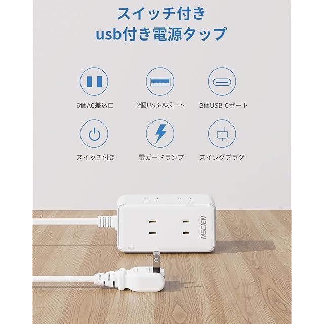 商品名:Mscien usb コンセント 延長コード 5m スイッチ付き 電源タップ usb付き 6個AC差込口 2個usb-c 2個usb-a コンセントタップ 蛸足コンセント 分岐 雷ガード付き oaタップ スイングプラグ 壁掛け 旅行 出張