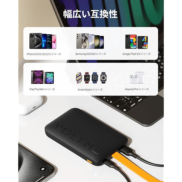 商品名:VOLTME モバイルバッテリー タイプc 10000mAh 大容量 ケーブル内蔵 薄型 モバイル・バッテリー Type-C×2 + Type-A 最大22.5W出力 三台同時充電可能 急速充電 PD3.0 QC3.0 usb c 携帯バッテリー スマホ充電器対応/PSE技術基準適合 出張/アウトドア/防災/停電対策/緊急用 iPhone iPad Android 各種対応(ブラック)