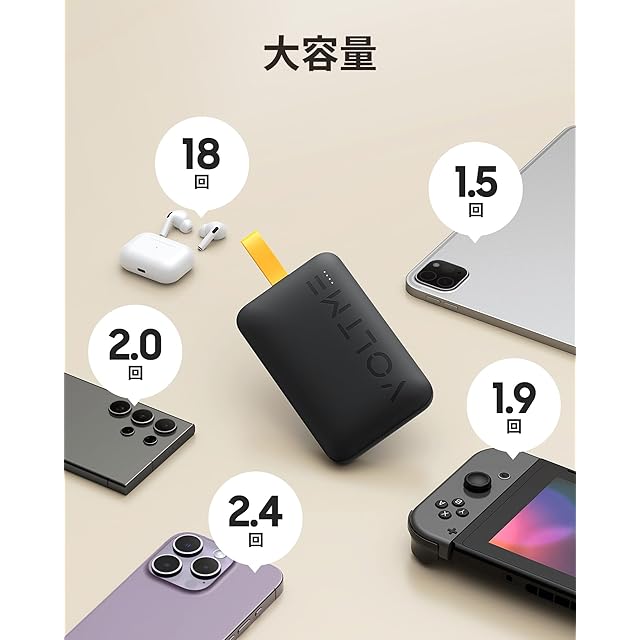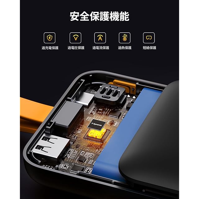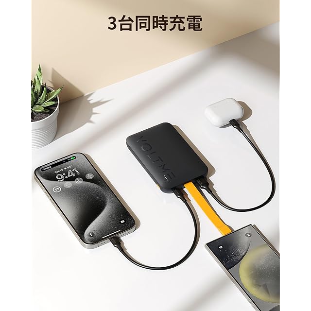 【最大3台同時充電・VOLTME独自技術】内蔵USB-Cケーブル+USB-Cポート(入出力)+USB-Aポート(出力専用)の3ポート搭載で、スマホ・タブレット・イヤホンなど最大3台のデバイスを同時に充電可能。独自技術「V-Dynamic」が接続機器を自動で判別し、各デバイスに最適な電力を供給して、安全かつ効率的に充電を行います。