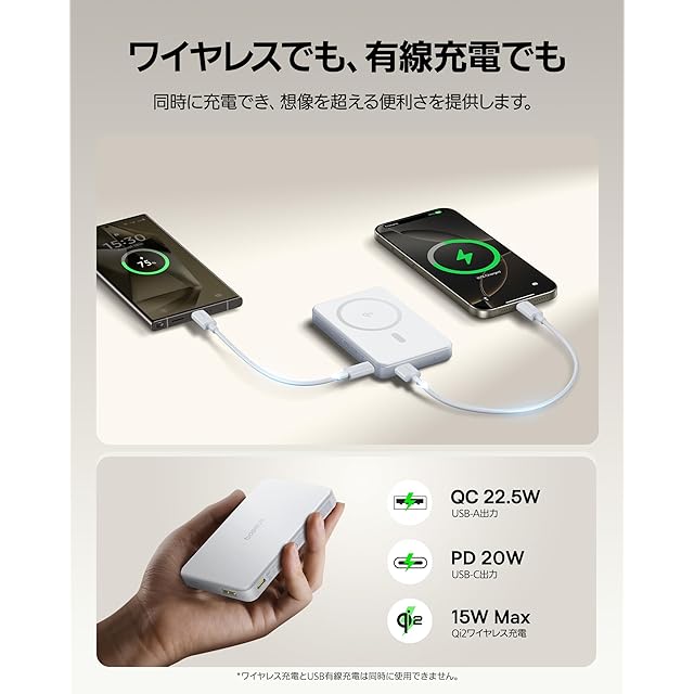 【有線接続で2台同時充電】ワイヤレス充電だけではなく、USB-C(PD 20W)とUSB-A(SCP 22.5W / QC 18W)の2ポートを搭載。単独での充電だけでなく、有線では2台同時充電が可能です。アンドロイドスマホ、iPad等のタブレットなど、さまざまなデバイスに使用できます。(*ワイヤレス充電とUSB有線充電は同時に使用できません。)