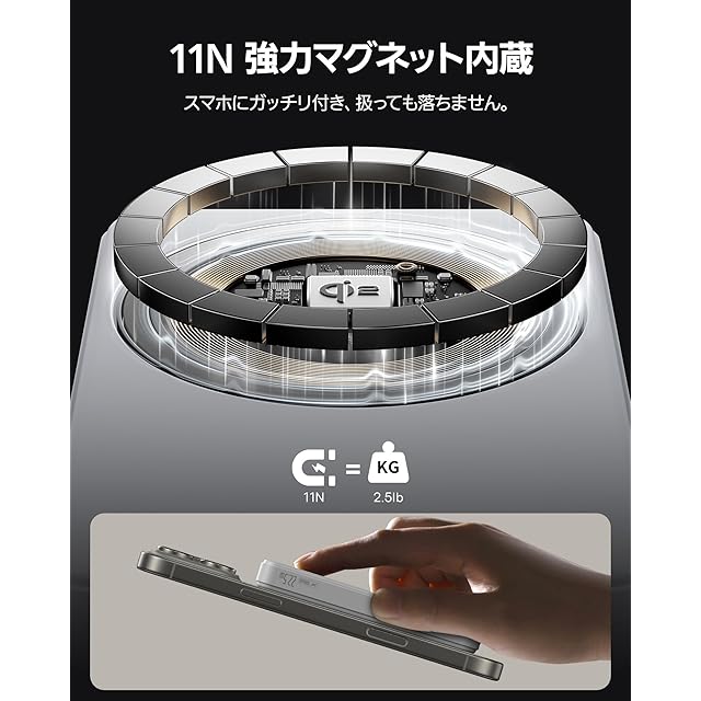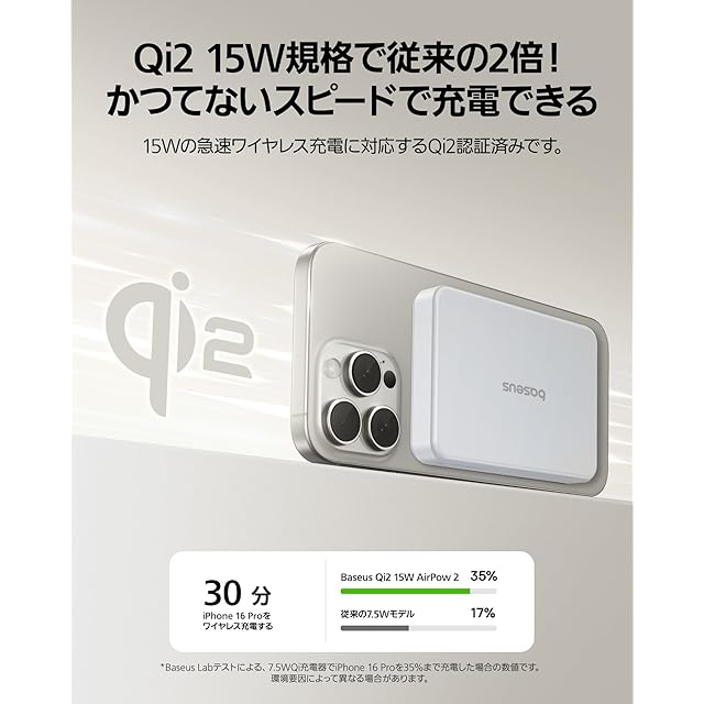 【Qi2認証 15W急速ワイヤレス充電】Baeus AirPow II モバイルバッテリーはQi2認証済みで、iPhone 16/15/14/13/12シリーズにワイヤレスで急速充電が可能です。従来の7.5W出力のMagSafeバッテリーよりも、15Wの2倍の速さで充電できます。スマホにピタッとくっつくだけで充電が開始し、強力マグネット内蔵のため位置ずれがなくて熱も抑えられ、バッテリー寿命を延ばすこともできます。iPhoneへの充電を簡単・効率的にできるのが魅力です。(*QI ID: QI-22047)