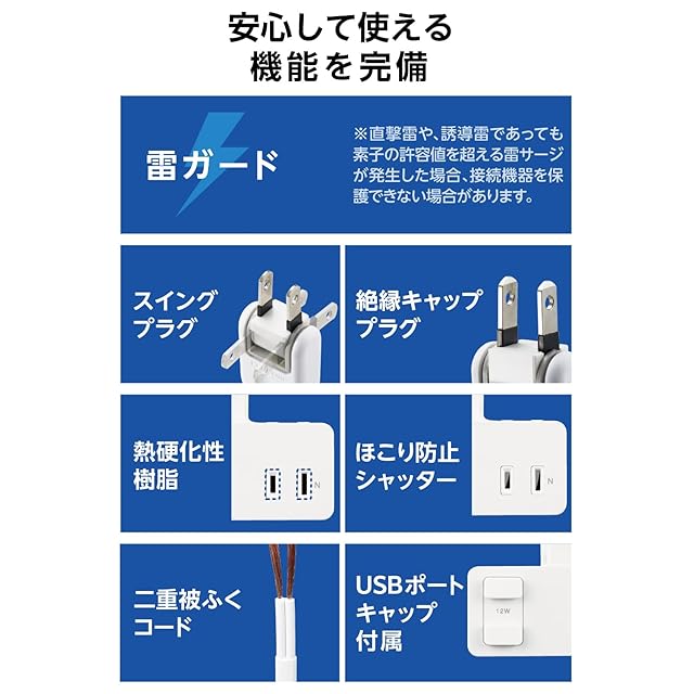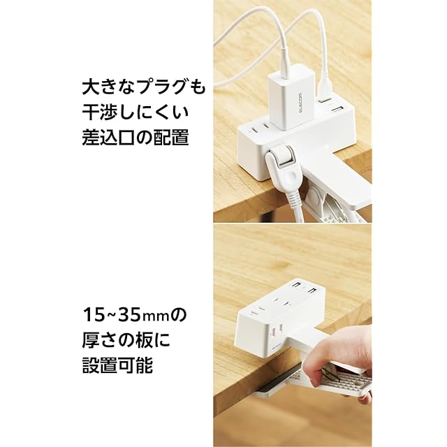 商品名:エレコム 電源タップ クリップ 1.5m [ 3個口 USB-A×2 ] 雷ガード 極性対応 吊り下げ ほこりシャッター付 スイングプラグ ホワイト ECT-3015WH