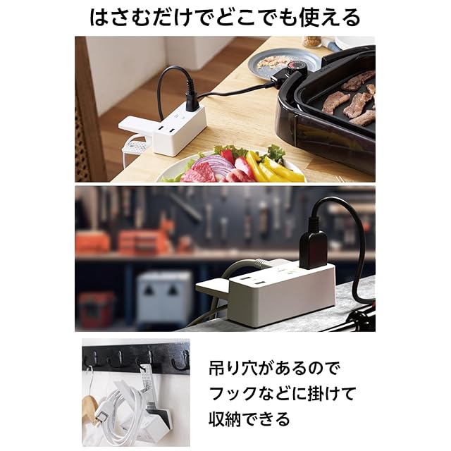 机などに挟んで使えるクリップ機構を搭載した、USB-Aポート付きの電源タップです。常に挟んだままでの使用だけでなく、タップを常設できないダイニングテーブルなどに一時的に電源を設置できます。ホットプレートなどの調理機器の利用や、テレワークや宿題をする際に便利です。コードの長さは約1.5mです。