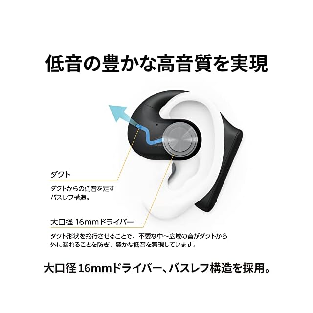 大口径の16mmドライバーを搭載することで、周囲の音と迫力のサウンドを両立。本体内部には、バスレフ構造を採用。当社の音質マイスターがスピーカー開発で培った技術と経験を生かして音響設計を最適化することで、耳をふさがない新形状デザインの完全ワイヤレスイヤホンながら低音の豊かな高音質サウンドを実現。