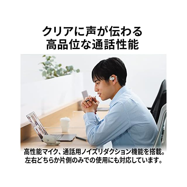 本体左右それぞれに2つの高性能MEMSマイクと、独自の通話用ノイズリダクション機能を搭載。オンライン会議などの通話時に、クリアで高品位な音声コミュニケーションを実現。また、本機のマイクON/OFFを切り替えるマイクミュート機能と、左右どちらの片耳使用にも対応。