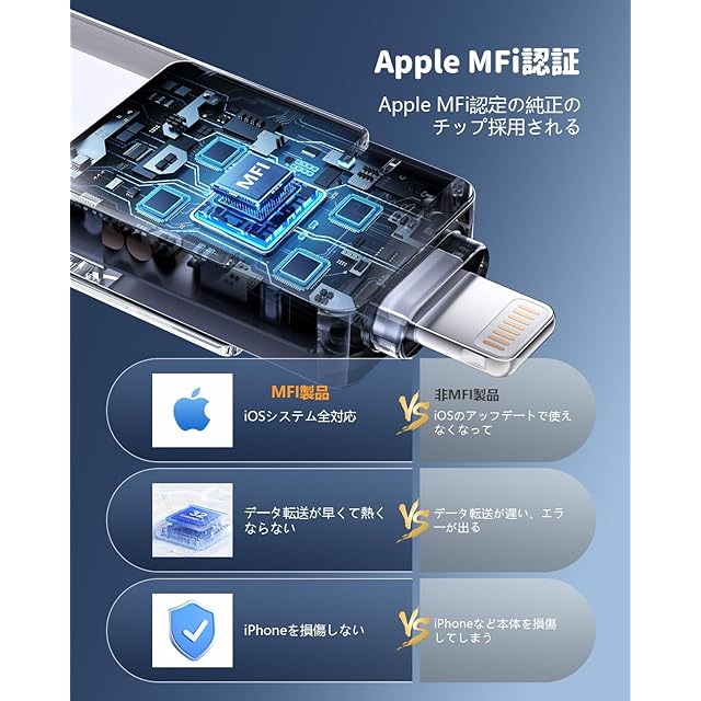 ✔【Apple MFi認証取得・高い互換性】iPhone 用USBメモリでは、アップルが設けた認証プログラム Apple MFi が認定されております。これアイフォン バックアップはアップルより提供されたライトニングコネクタを使って、アップルのサポートを受けて作成された周辺機器です。なので、すべてのiPhoneおよびiPadシリーズと互換性があります。iPhone 14 /14 Pro/13 Pro Max/13 mini/ 12 /12 Pro/12 Pro Max/12 mini/ 11 /11 Pro/11 Pro Max / SE/X /XS/XS Max /XR/8 Plus/8 / 7 Plus/7 /6s Plus/6s/6 6 Plus /iPad Air iPad(第9/8/7/6/5世代)iPad mini(第6/5/4/3世代)10.5インチiPad Pro 9.7インチiPad Pro / iPod touch 6/7/ MacBook Air/Macbook Pro/ iMac/PC /ノートパソコンなどのデバイスに対応します。