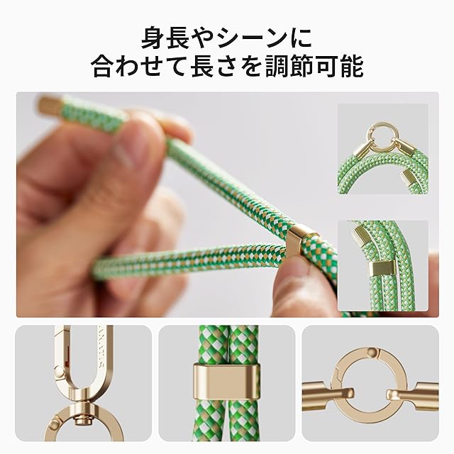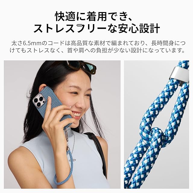 【抜群の快適さと調節可能な設計】ストラップは最大13cmから最小6cmまで調節可能で、身長やシーンに合わせて最適な長さに変更可能。太さ6.5mmのコードが首や肩への負担を軽減し、長時間の使用でも快適です。