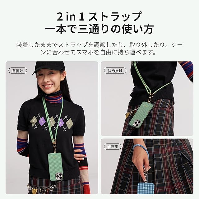 【多機能2 in 1 ストラップ】斜め掛け、首掛け、手首掛けの3通りの使い方が可能なスマホストラップ。シーンに合わせて自由に使えるデザインで、日常のどんな場面でもスマートに対応します。スマホや必需品をシーンに合わせて自由に持ち運び、快適な使用感を実現します。