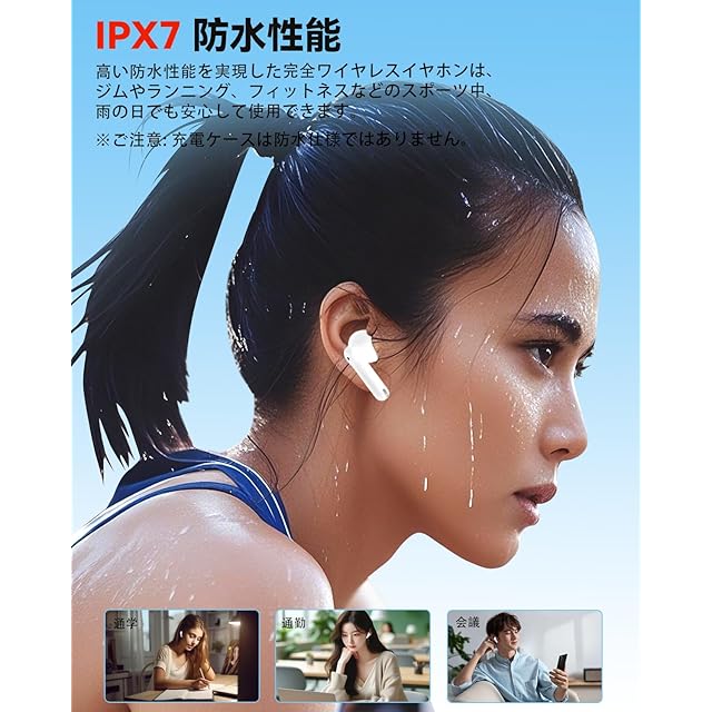 【IPX7防水性能】IPX7 防水防汗。高い防水性能を実現した完全ワイヤレスイヤホンは、ジムやランニング、フィットネスなどのスポーツ中、雨の日でも安心して使用できます。 ※ご注意:充電ケースは防水仕様ではありません。