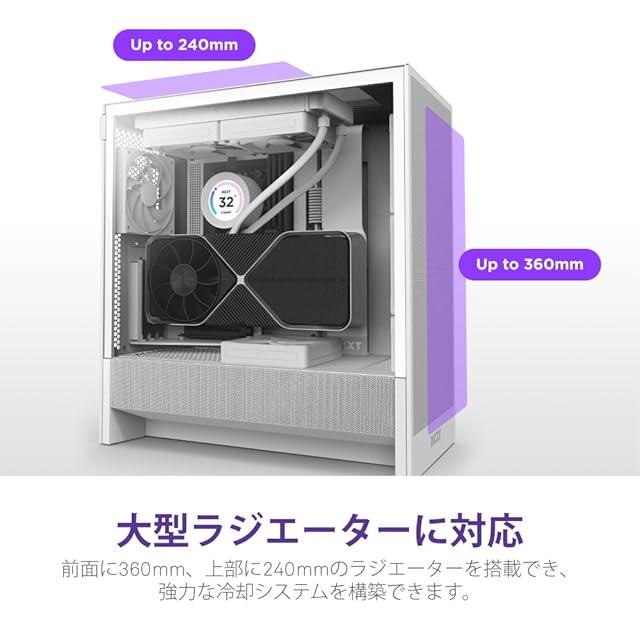 最大360mmのフロントラジエーターと240mmのトップラジエーターをサポートし、強力な冷却性能を提供します。