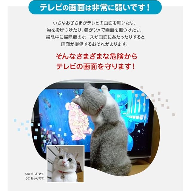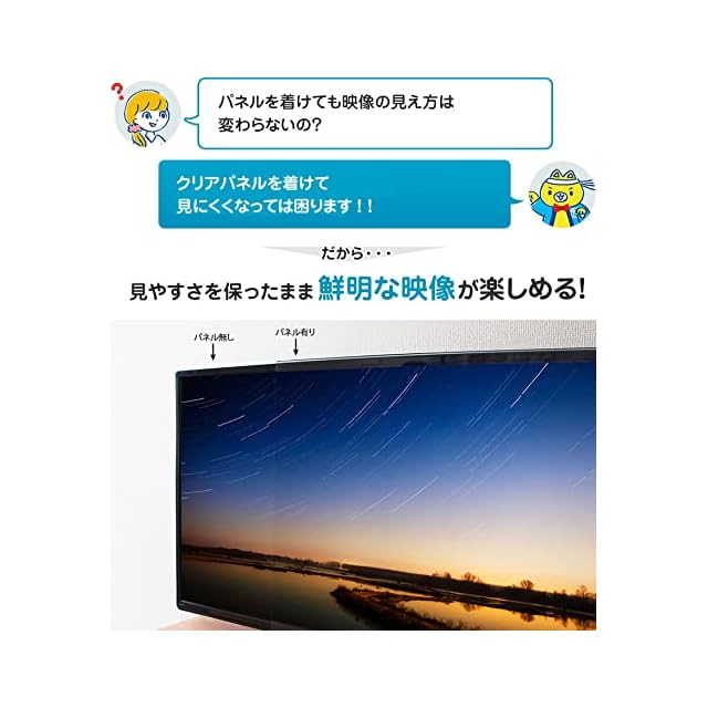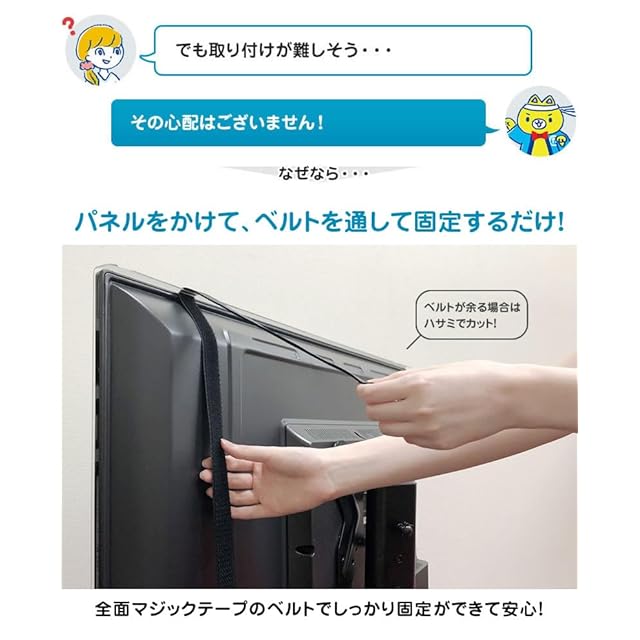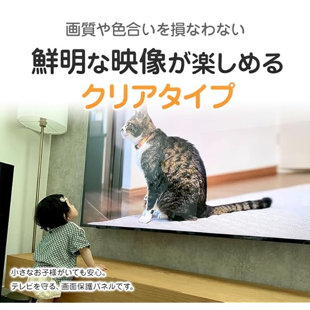 安心、安全のベルト固定式!鮮明な映像を楽しめるクリアタイプ!様々な危険から液晶テレビを守ります! 液晶テレビ 保護パネル 厚さ2 .0mmの頑丈なアクリルパネルです。 テレビに引っ掛けてベルトで固定するだけの簡単取り付けです。 液晶テレビの外観を損ねません。 パネルはクリアタイプなので、鮮明な映像をお楽しみいただけます。 ※こちらの商品は液晶テレビ本体ではございません。 ※こちらのパネルはノングレア(映り込み軽減)タイプではありませんので、設置環境によっては映り込みが起こる場合がございます。