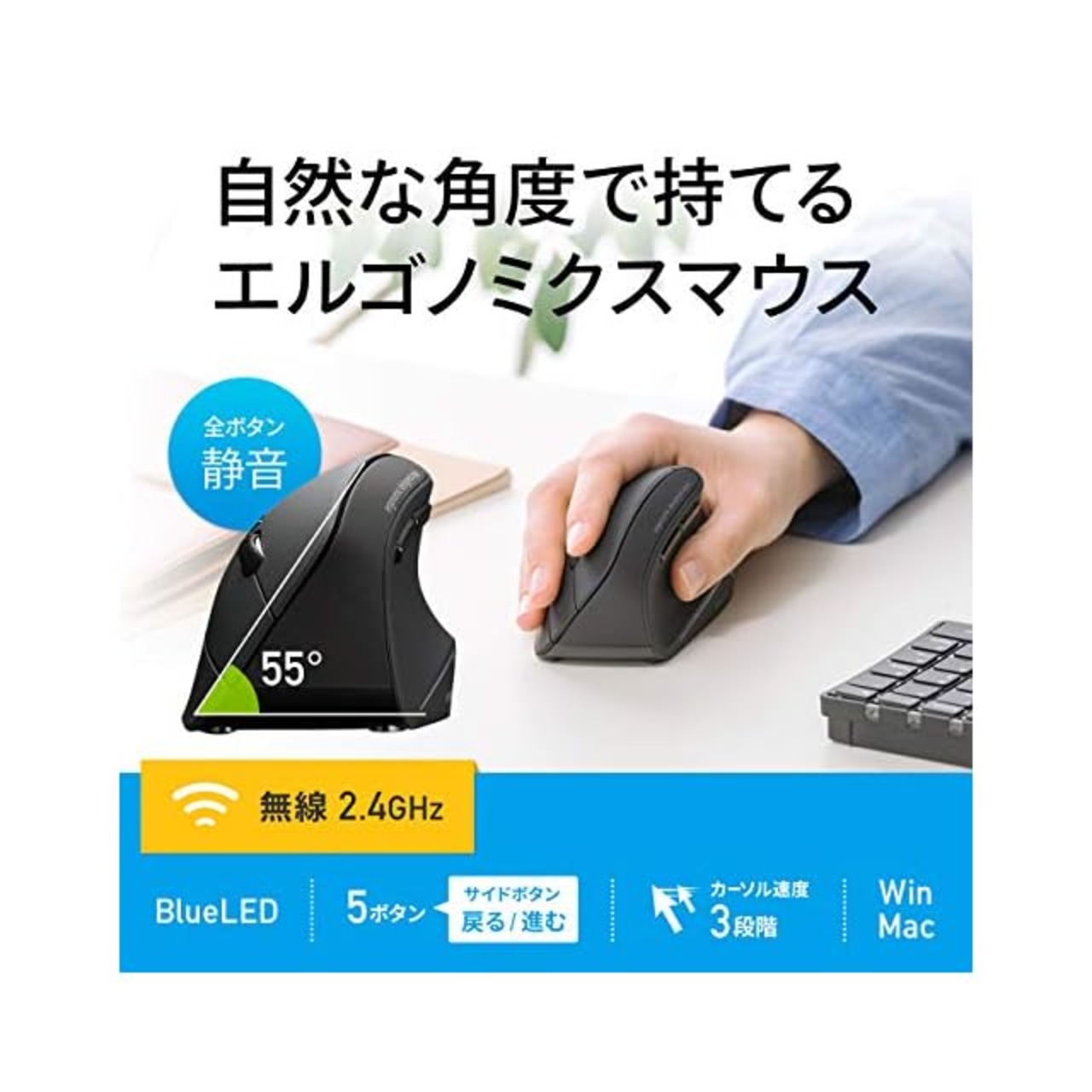 商品名:サンワサプライ エルゴノミクスマウス 静音 ワイヤレス 無線2.4GHz 腱鞘炎防止 ブルーLED 5ボタン 大型 MA-ERGW10N