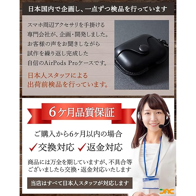 【日本品質の理由】大手のスマートフォン周辺アクセサリーを手掛ける専門会社が、企画・開発しました。「お客様にとって価値のあるものを、お求めすく提供したい」という想いで、お客様の声をお聞きしながら試作を繰り返し完成した見た目高級感があるAirPods Proケースです。日本人スタッフによる出荷前検品済。6ヶ月メーカー品質付で、日本国内で日本人スタッフがサポートします。