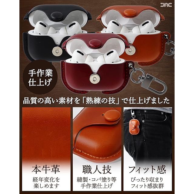 【本革仕様と熟練の技】長くお使いいただけるように、素材、縫製、フィット感にこだわりました。素材:質感抜群の品質の高い「本牛革」を使用しました。毎日の持ち歩きにも耐えられる高耐久性と、長年使うことで経年変化を楽しめることは本革ならでは。縫製:縫製、コバ塗りなど作業工程は、熟練の職人による手作業で仕上げています。フィット感:AirPods Proがぴったり収まるフィット感は、熟練のなせる技。手に取っていだだけると品質の良さを実感いただけると思います。カラビナ取り付け穴にハトメ金具付が施されています。