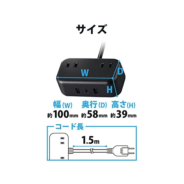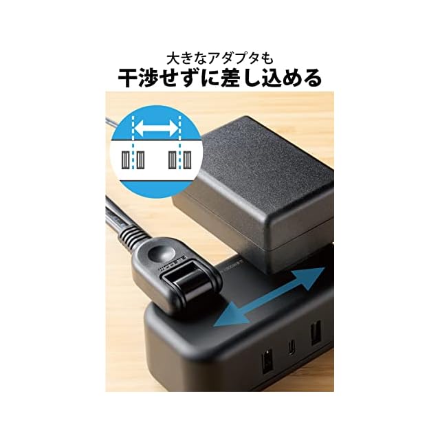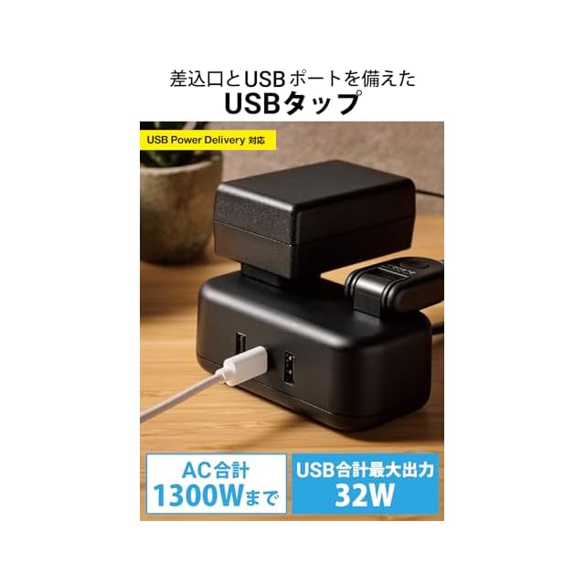 2つの差込口と1つのUSB Type-C(TM)(USB-C(TM))ポート、2つのUSB-Aポートを備えたUSBタップです。USBの最大出力は32Wで、別途充電器などを用意することなく複数台同時充電ができます。また、USB Power Delivery 20Wが利用でき、スマートフォンやタブレットの急速充電も可能です。