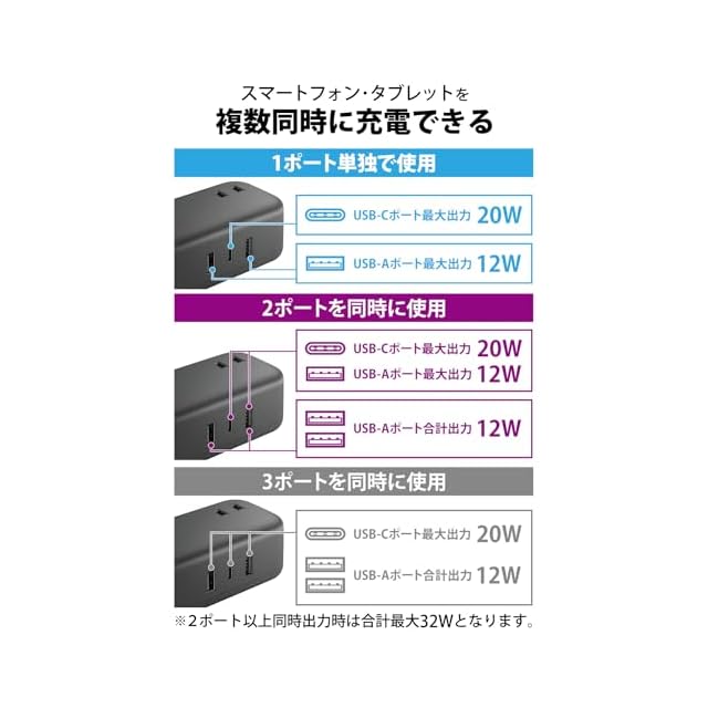 USBの最大出力は32Wで、別途充電器などを用意することなく、対応するスマートフォンやタブレットを複数同時に充電できます。