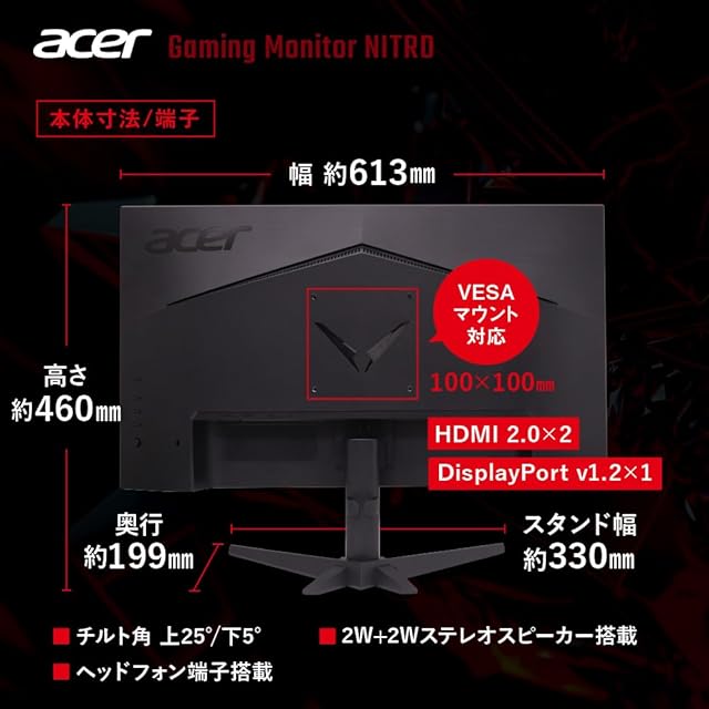 商品名:Acer ゲーミングモニター 27インチ IPS フルHD 非光沢 200Hz 0.5ms sRGB 99% AMD FreeSync Premium HDR10 HDMI 2.0 DisplayPort v1.2 スピーカー・ヘッドフォン端子 搭載 Nitro VG270X1bmiipx