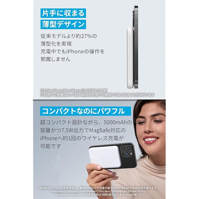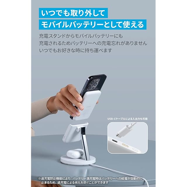 取り外してコンパクトかつパワフルなモバイルバッテリーとしても使える:充電スタンドからマグネット式ワイヤレス充電対応モバイルバッテリーにも充電されるため、バッテリーへの充電忘れがありません。モバイルバッテリー部分は従来モデルより約27%の薄型化を実現し、充電中でもiPhoneの操作を邪魔しません。さらに超コンパクト設計ながら、5000mAhの容量かつ7.5W出力でMagSafe対応のiPhoneへ約1回充電が可能です。※USB-Cケーブルを利用すると、最大12W出力で充電可能でいつでもお好きな時に持ち運べます。※iPhone13 / iPhone13 Pro / iPhone13 Pro Max / iPhone 14 / iPhone 14 Pro / iPhone14 Pro Maxへの満充電回数は1回未満になります (Anker調べ) 。